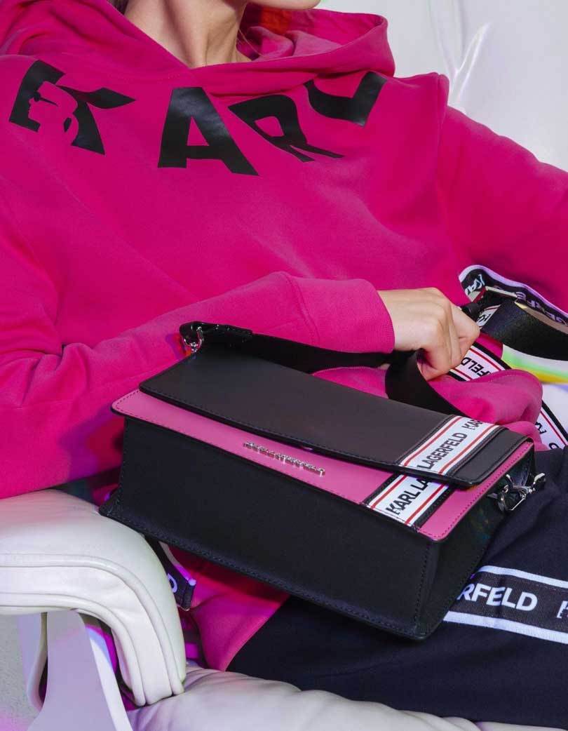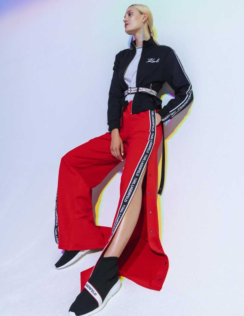 "Sporty, high neck bomber jackets, sweatshirts and t-shirts play with Lagerfeld's well-known black and white palette, infusing red and pink tones, and topped off with signature Karl logo graphics", reads Zalando's website.