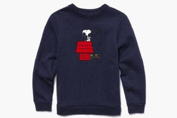 Snoopy, Linus, Charlie Brown, and Lucy have been emblazoned across several Lacoste items like pique polos and sweatshirts. The designs are available in styles for men, women, and children. Colors include white, navy, grey, and black, with price points ranging from 85 dollars to 145 dollars.