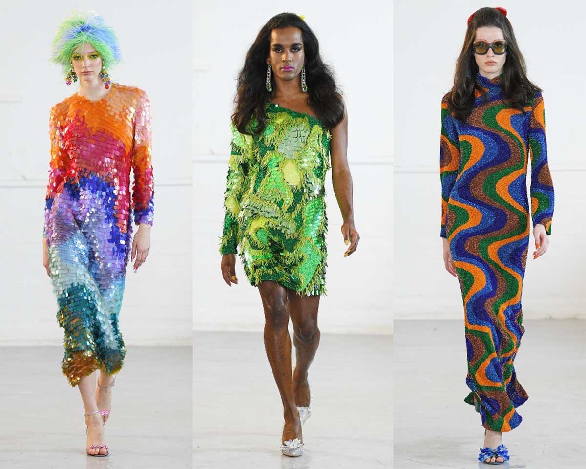 The boldest sequin display came from Ashish who was on a mission to bring joy with his high-energy autumn/winter 2020 collection that was filled with rainbow chintz across tailored jackets, halter neck jumpsuits, and dresses featuring polka dots, geometric patterns, zebra stripes, leopard spots and over the top florals.