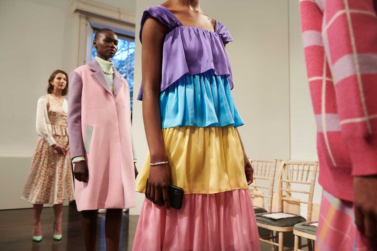 The collection started with a sombre feel for Bora Aksu with the use of black, however, it wasn’t long until the Turkish-born designer added a sense of romance with soft feminine drapes and structured dresses presented in lilac, orange and yellow, alongside more subtle hues of soft blues and pink.