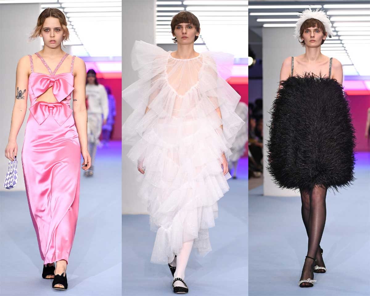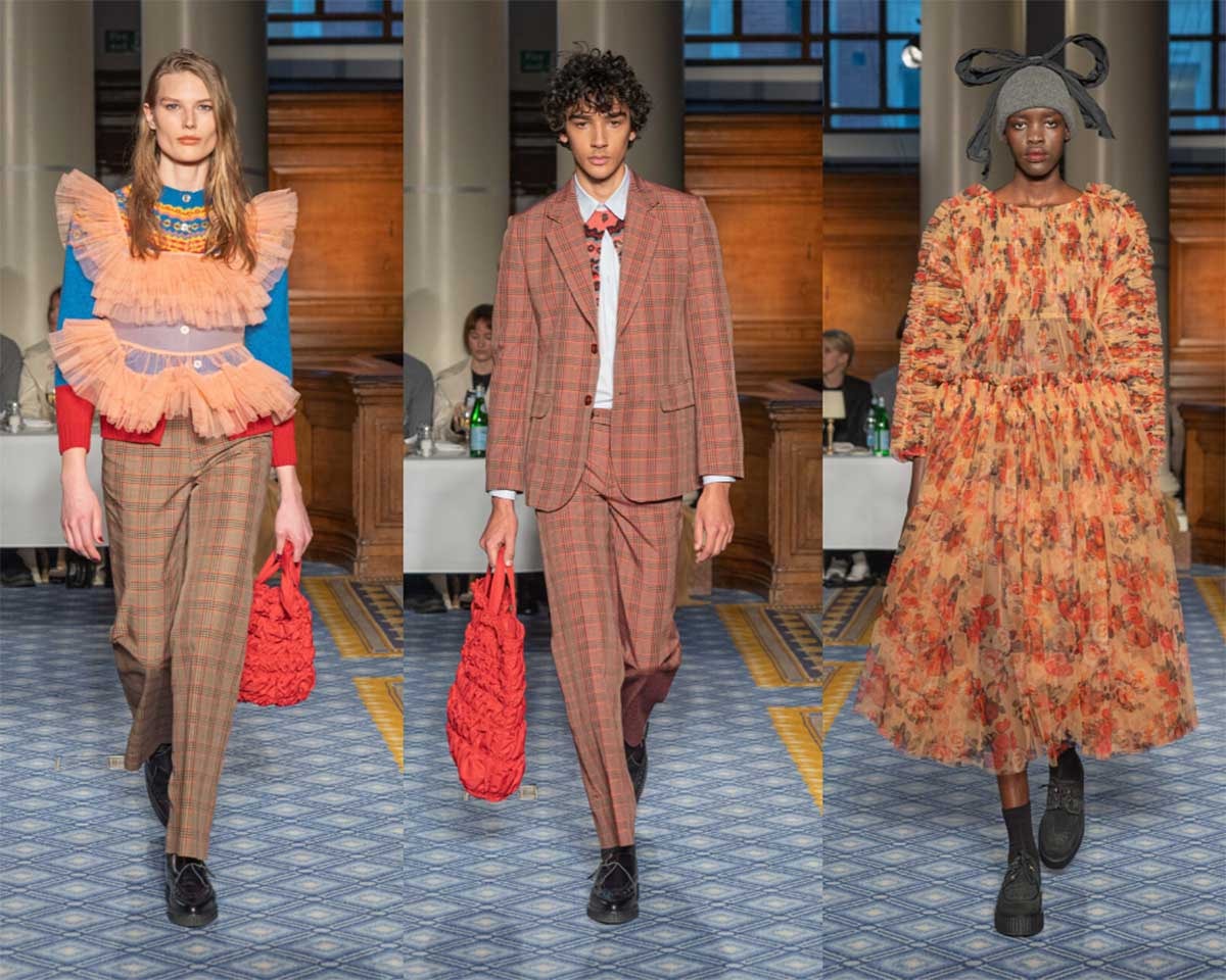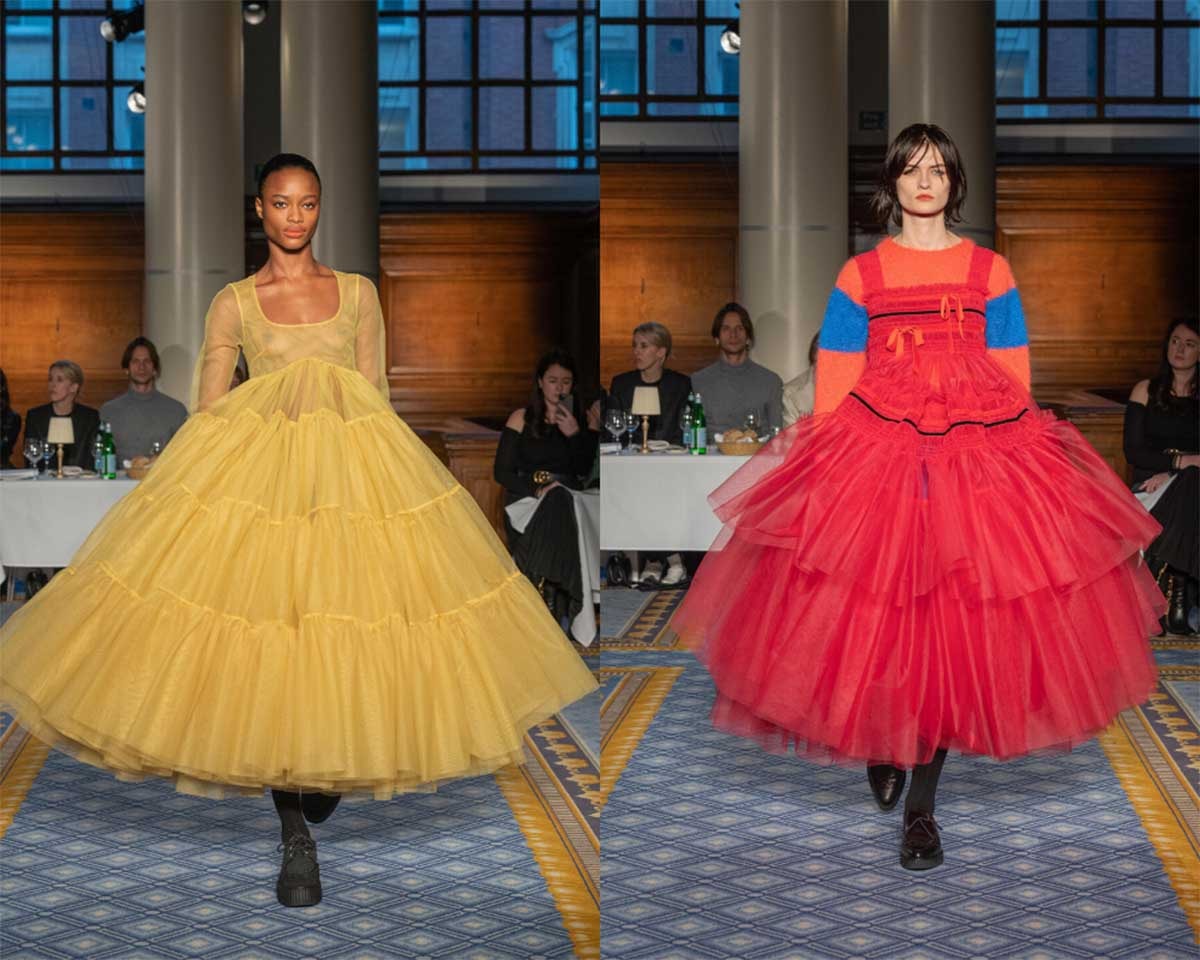 Tulle was seen in abundance at Molly Goddard, the London Fashion Week favourite has become know for her sugary tulle ballgowns and this season she added menswear for the first time, inspired by her boyfriend, Tom. The tailored check trousers, separates and suiting, were sent down the catwalk alongside shimmering and billowing floor-length tulle and taffeta gowns styled over chunky jumpers and Fair Isle cardigans.