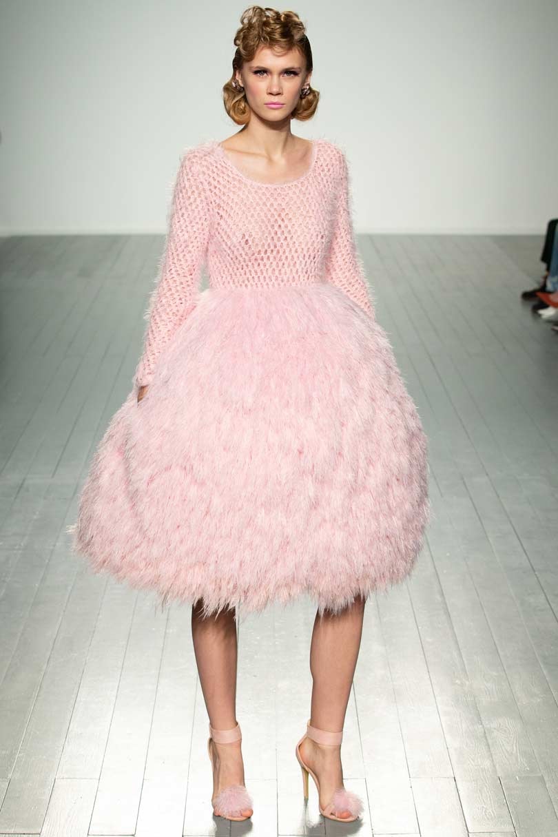 He sees knitwear as sculpture and each season he experiments with different volumes to create sensual silhouettes and for autumn/winter he offered a glamorous takes on Hollywood dressing with cocktail gowns with puff ball skirts and fringe detailing, as well as flowing capes with shredded feather-like qualities over seamless smooth bodycon jumpsuits that highlight his innovative knitwear and stitching techniques.