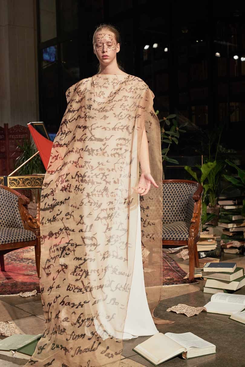 The mainly monochromatic collection, has print heavily weaved into the designs, with the featured print inspired by Queen Elizabeth I’s Tilbury speech showcased alongside digitised images of the Queen, royal insignias, historical cartography and hymn sheets on dramatic flowing cloak-like dresses, belted silk dresses with kimono sleeves and tailored trousers, which feature accents of pale gold, greens and rich blood red, shining through on the black and white looks.