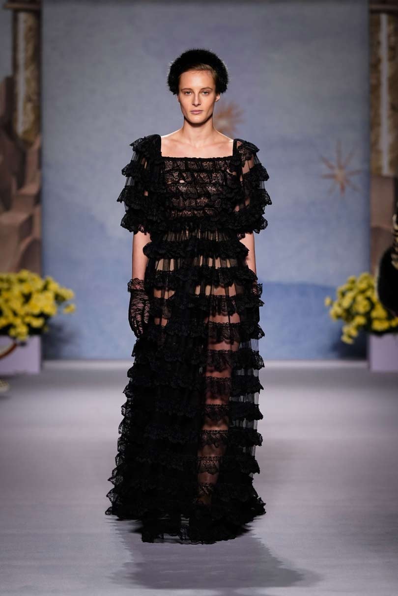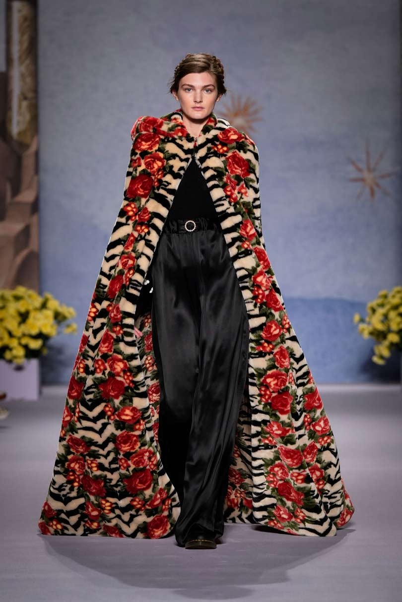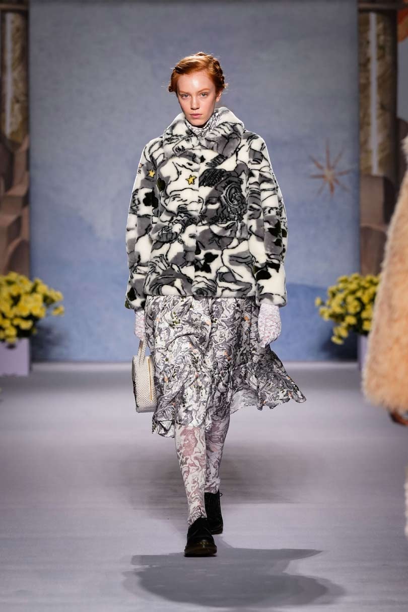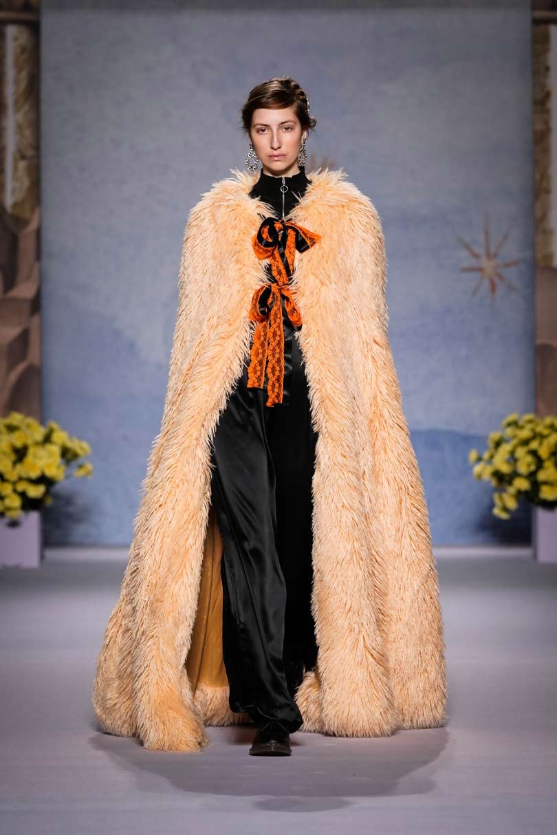 Shrimps first made its mark with its faux fur outerwear, leading the conversation on cruelty free fashion, and it was its bright yellow faux fur coat that was the standout, its dressing-gown style will surely be an instant sellout. Other key looks included a cape floor length apricot faux fur with tie detailing and knee length and cropped jackets with painting-like patterns swirled on, telling the stories of the gods and goddesses.