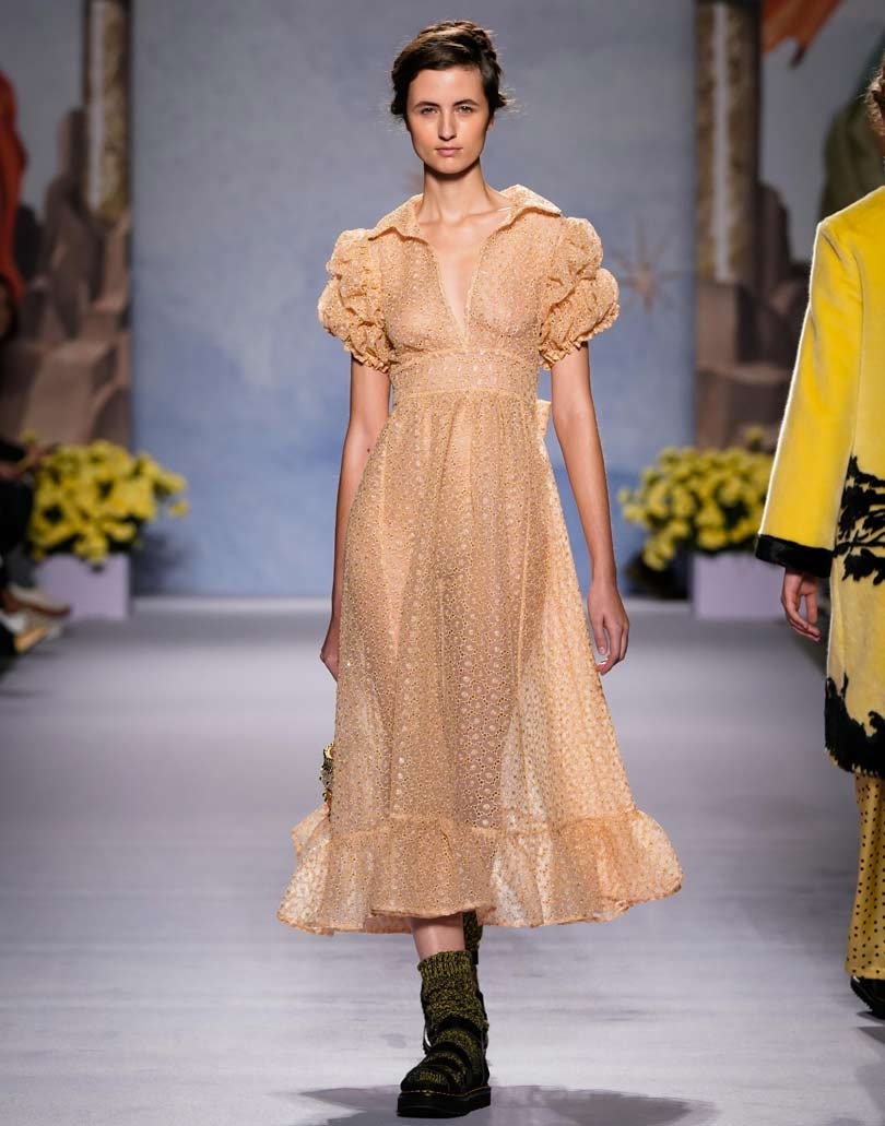 The vibrant colour palette of bright orange, banana yellow, soft apricot, peacock blue and gold echoed the ethereal feel of the collection, as well as continuing the Shrimps need for colour and fun even during the autumnal months, and these hues looked beautiful in the prairie-meets-Greek goddess gowns as well as the flattering dresses with puff sleeves.