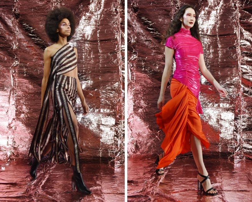At the core of the collection are bold figure-hugging silhouettes with avant garde drapes in a mix of delicate sequin fabrics are all finished with Lycra back panels to allow flexibility and movement.