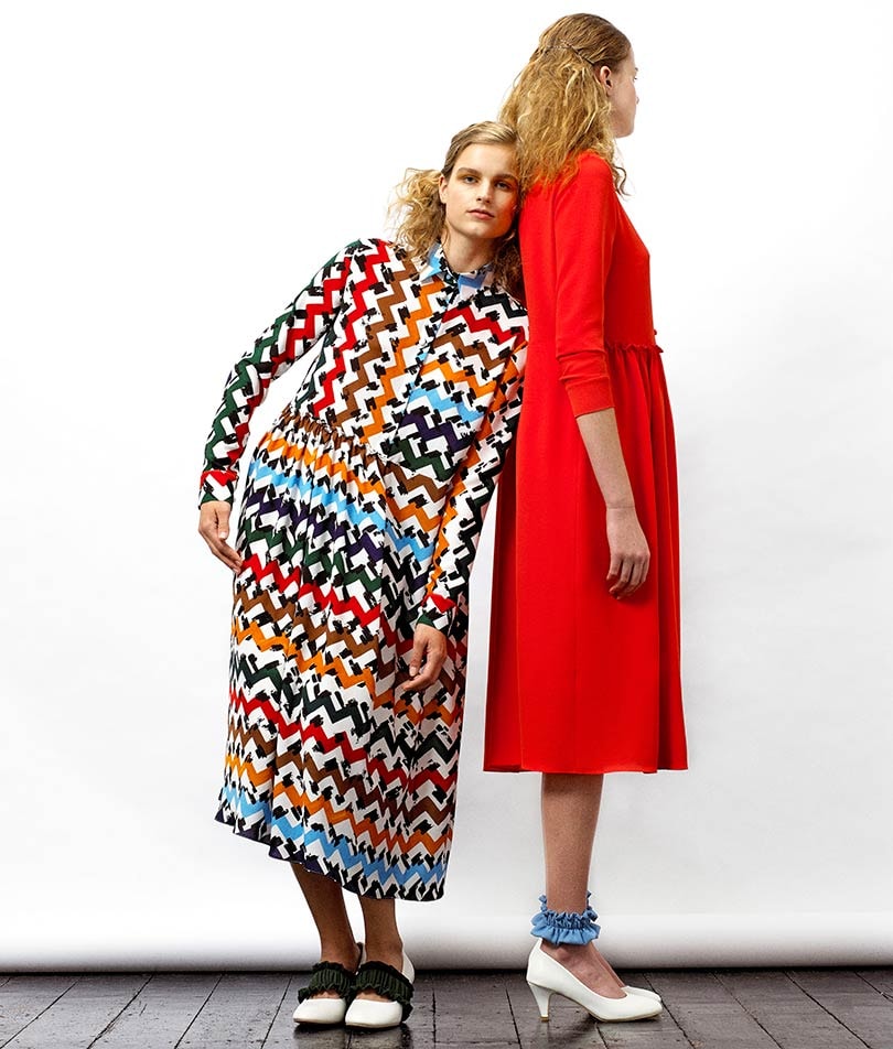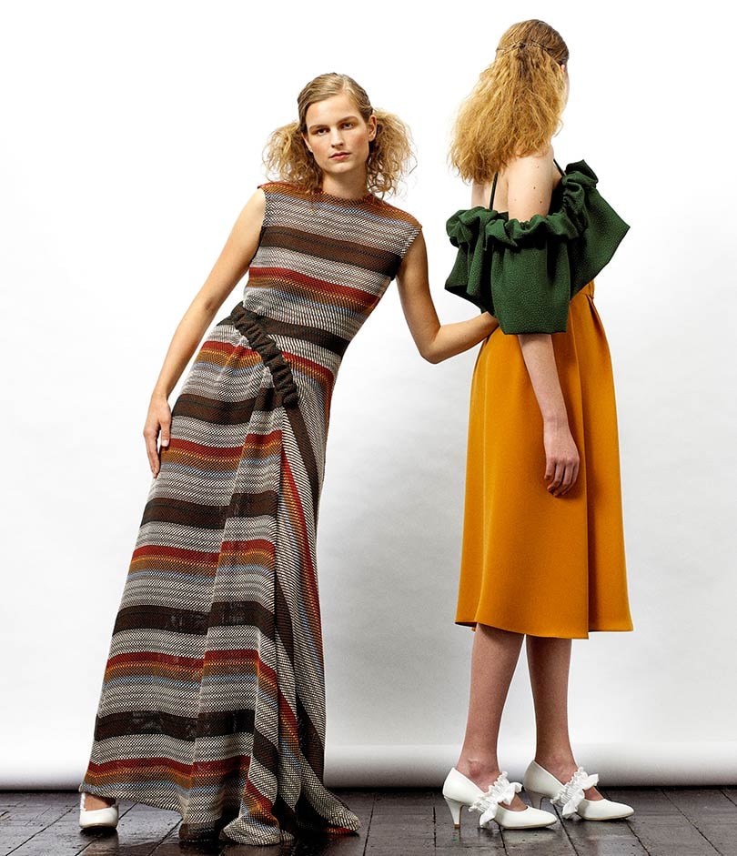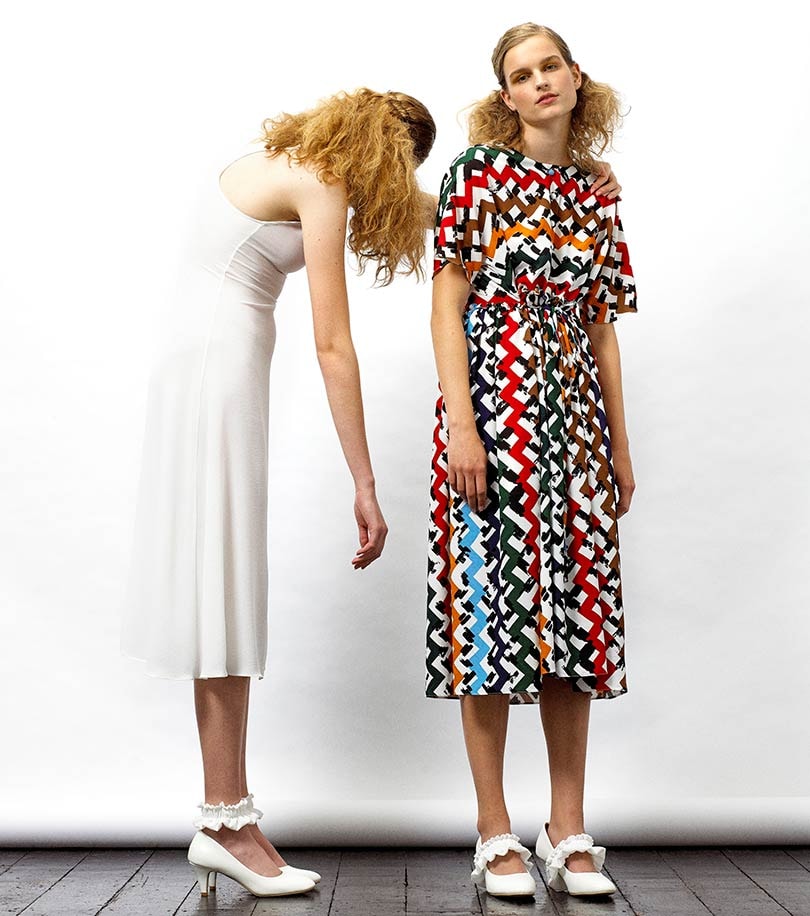 The collection itself, expands on Lee’s experimentation with ruching and ruffles, while maintaining the designer’s tailored, womanly shapes, and saw the label’s signature Flou Bubble Jacquard fabric showcased in scarlet, ivory and bottle green, alongside a crinkle georgette in brown and ivory, and a graphic, hand-painted zigzag print. Highlights included the spaghetti-strap dresses and long-sleeve A-line dresses, as well as the feminine skirts and separates that were accented with hand-covered, multicoloured dome buttons and buckles.