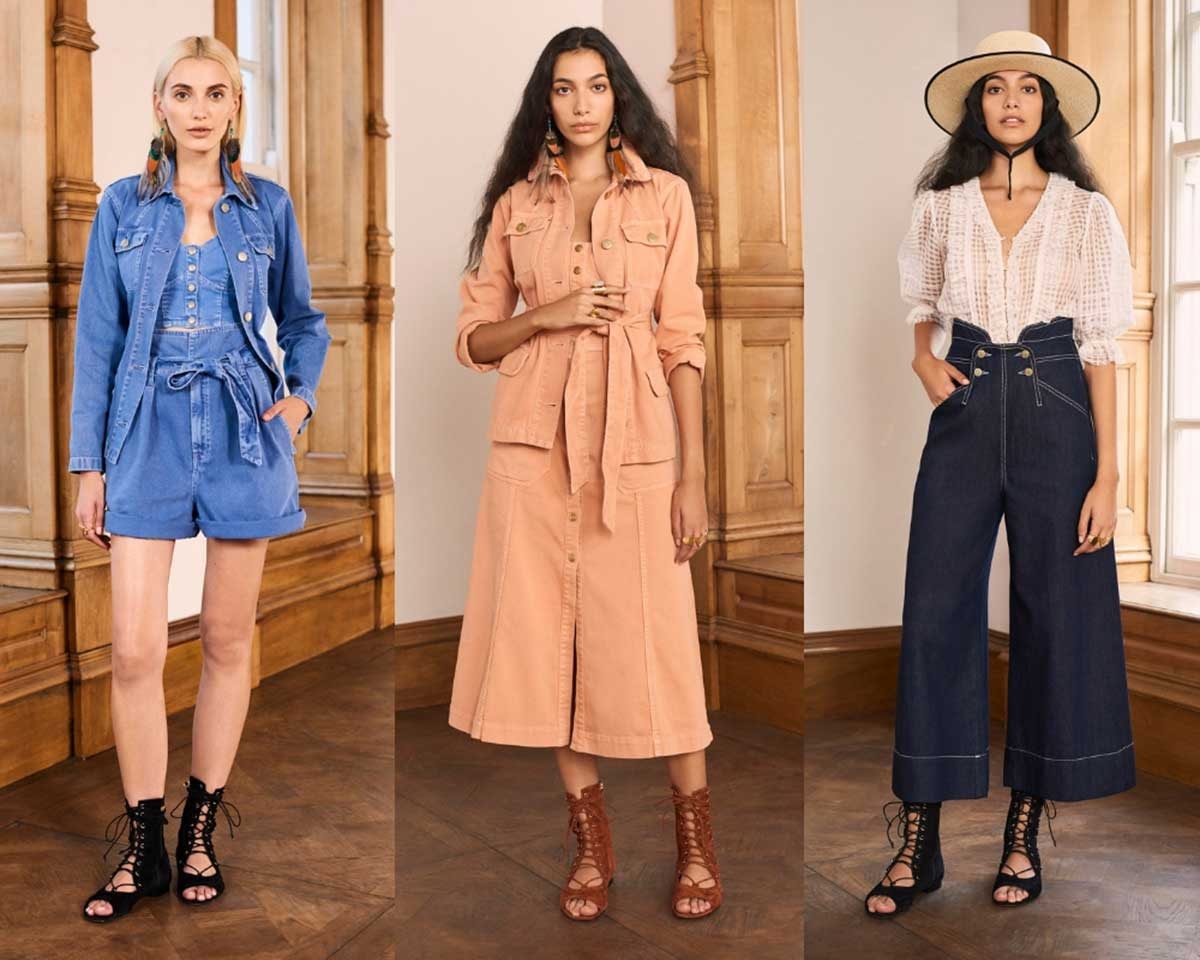A key highlight was the denim, with styles including Capri, wide-leg with sailor button front detailing as well as a button-through skirt with matching bodice top and jacket in French blue, dark washed denim and white. Additional versions were adorned with Matisse inspired graphic leaf prints in sugary pink with white and black with copper orange motifs.