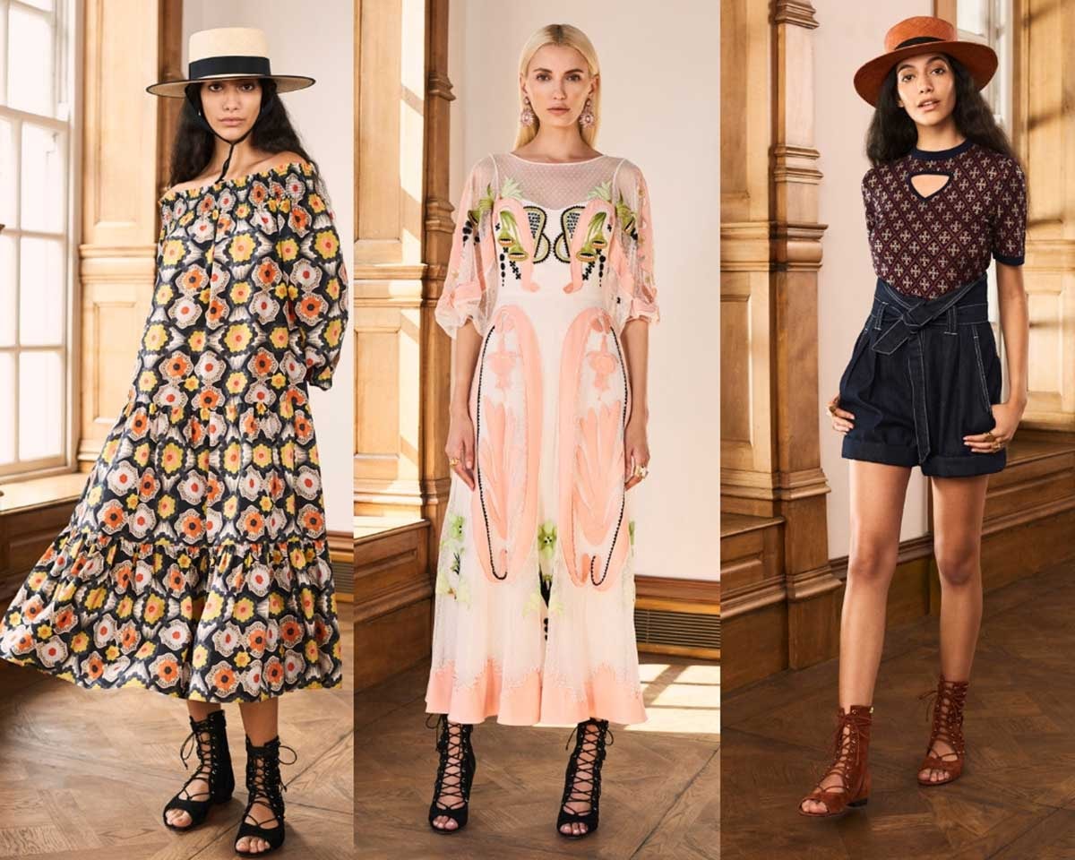 The idea of the collection is to take the Temperley woman from “Hotel Boudoir, French Riviera, Peggy’s Venice and Botanical Retreat” offering daywear featuring high waisted denim paper bag style shorts to explore, while for evenings spent al fresco there were long line smoking jackets worn with matching wide-leg trousers, and crisp cotton, line and cotton silk checks in short dresses in a soft colour palette of rosewater pink, cantaloupe, pastel jade green and seashell contrasted with the stronger orange, plum and vibrant tigerlily.