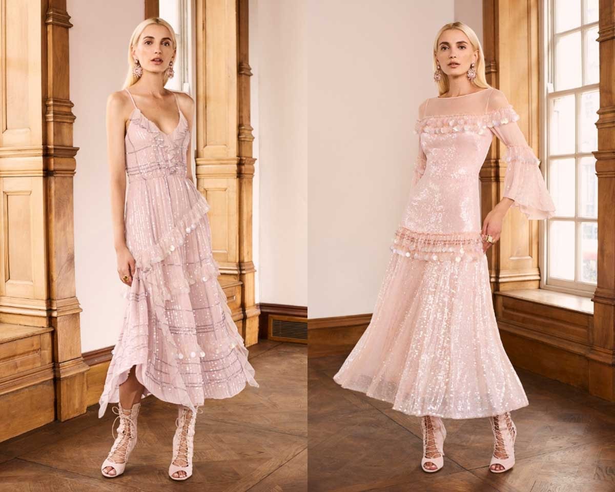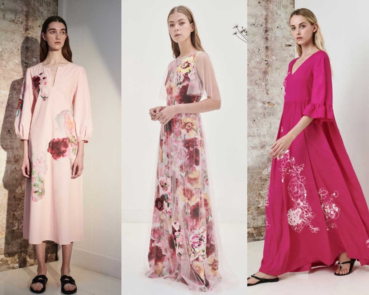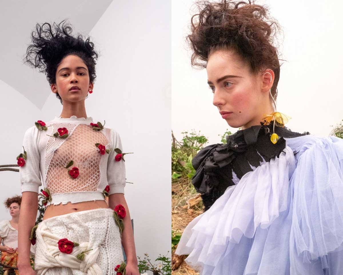 The magical romance of Alice Archer takes inspiration from watercolour paintings of Charles Rennie Mackintosh for spring/summer 2020. This collection sees Archer creating embroideries that feel like watercolours, using techniques including embroidered line drawings, painted prints sublimated onto embroideries of luscious peonies and delicate sweet peas, jewel-like sequin work and layered tulle to form textures which are rich and fluid.