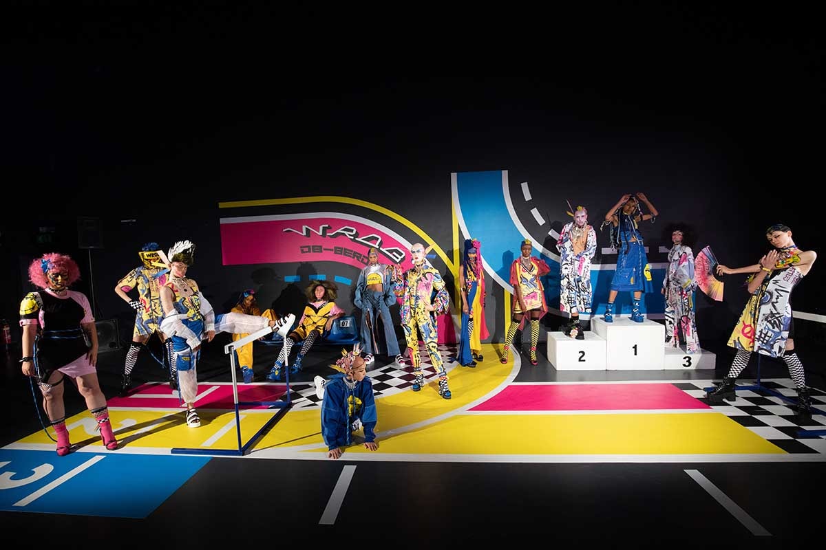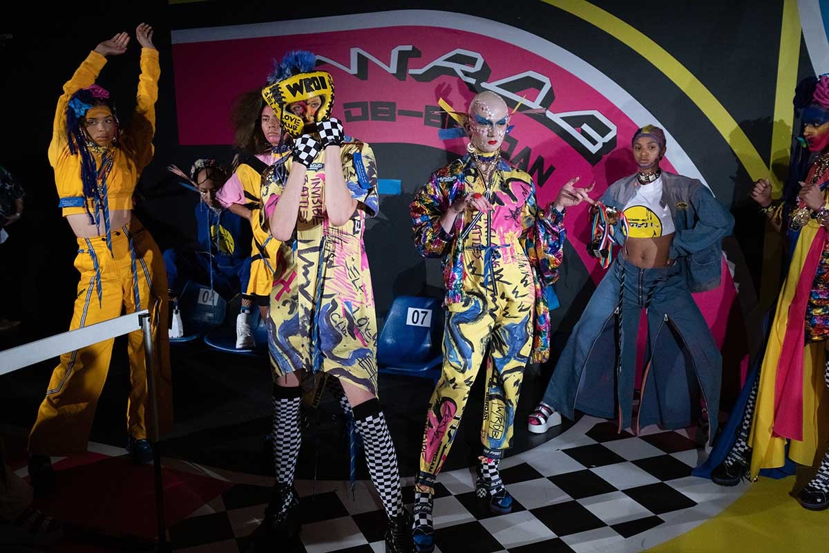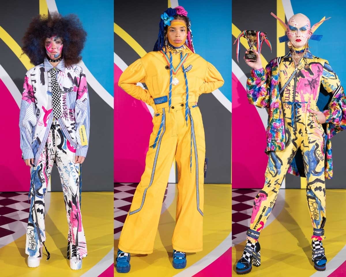 Entitled the ‘Self-Love Club’ collection, DB Berdan presented silhouettes inspired by the late 80's and early 90's hip hop and rave cultures, with bold colours, oversized tie-dye denim hoodies, and joggers that turn into shorts, which was all showcased in a chaotic, high-energy presentation with models sporting their personalities with customised underground footwear, fans and sports gear, enhanced with Olympic rings and pan inspired spiked up hair sculptures.