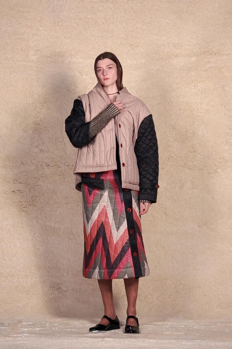 The collection features moleskin combined with satin, spandex printed with buffalo check, and alpaca knits with slick viscose. Hand treatments were applied to many garments to create geometric patterns.