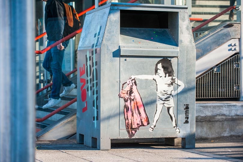 London-based eco-fashion campaign #LoveNotLandfill has unveiled clothes banks redesigned by anonymous street artist Bambi to encourage the recycling of unwanted clothes.
