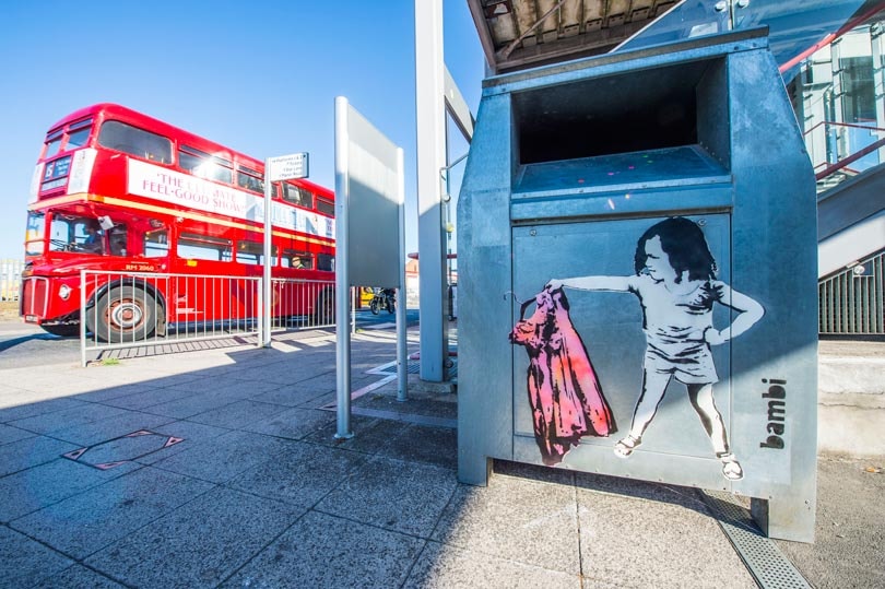 Bambi, who is often dubbed the ‘Female Banksy,’ has created a striking image of a young girl holding up a dress with disdain, and it is hoped that the bright and eye-catching, tongue-in-cheek image on the clothes banks located in busy shopping locations around London will make them particularly accessible for young fashion lovers.
