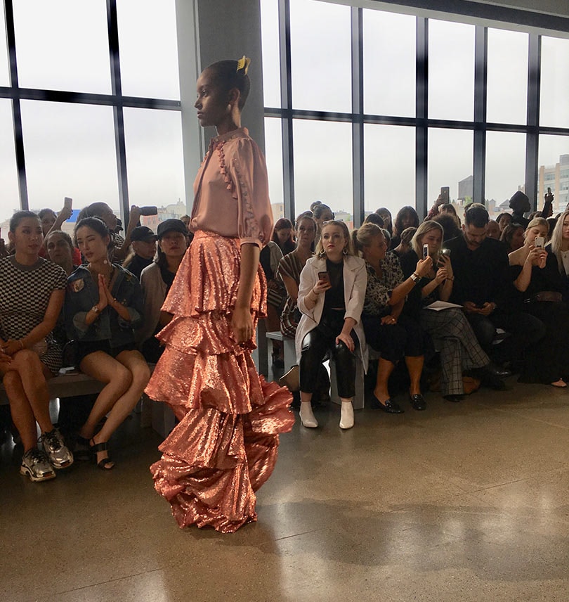 Marcel Ostertag’s S/S 2019 collection, entitled “Muse,” was Studio 54 meets the Kit Kat Klub, show-biz glitterati meets influencer bourgeoisie, and an unapologetic ode to loose-limbed ladies (and accompanying gentlemen) who twirl all night on stardust-coated dance floors. As the 30s were seen thorough the disco-dazzled eyes of the 70s, here the 70s were seen through today’s hungry social media filter. A palette of coral, sunshine yellow, lilac, pink, and multiple blues was punctuated with sequins, tassels and ruffles. There were tiered floor length chiffon frocks with billowy sleeves, rainbow-striped lurex leisure suits, and night-owl over-the-knee tiered fringe boots that would make the most somber occasion sashay into debauchery. And for the guys, an assortment of printed silk suiting, cashmere or broderie anglaise hoodies and unlined trenches in cornflower blue Guipure lace.