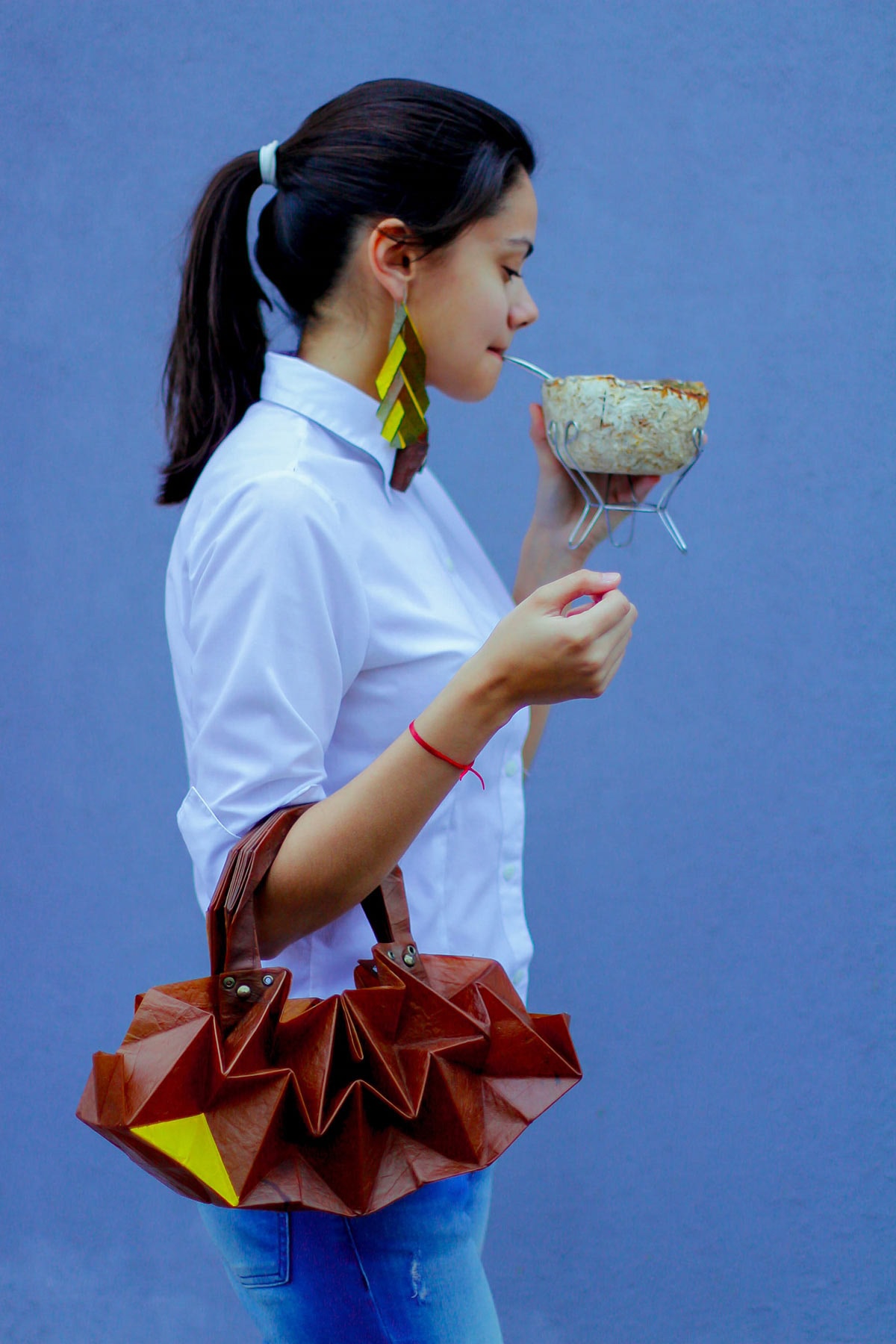 So far, the designer has presented two biomanufactured collections: “Grown objects,” from 2017 and “Eco warrior” from 2018. They both include fashion accessories such as bow ties, necklaces, hoops, hats and bags. His “Eco Warrior” collection has a special story: “A few years ago I went to the Philadelphia art museum, where there was a display of armour. And I found myself asking what current armour would be like in future museums. I can now answer that question and add another one: Will there be any armour to display in the future? Actually, if there isn’t, that means that we did things right. The concept of Eco warrior is like a warrior coming from another era to make us aware of the damage we are doing.”