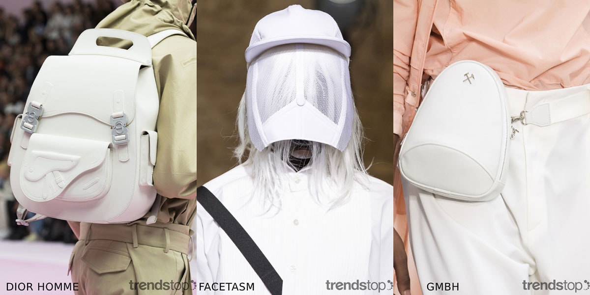 Taking a more futuristic approach, moulded constructions follow a minimalistic vision with structured shapes, smooth contours and bright white finishes. Space age pod-like backpacks and belt bags, as well as sci-fi style face masks putting a conceptual spin on the classic baseball cap, illustrate the new levels of experimentation happening across the men's fashion scene.