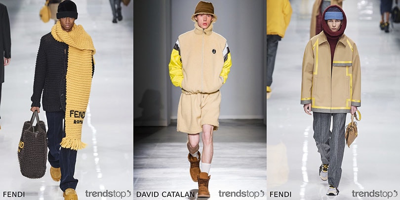 Yellow accents provide a vibrant pop of colour to menswear, re-appropriating a joyful summery hue for the winter season. Contrasting sleeves visible under gilets have a sporty look while a more industrial aesthetic is channeled via taped seams. Cold weather accessories in egg yolk tones make an uplifting splash against a dark backdrop of heavy-duty fabrics.