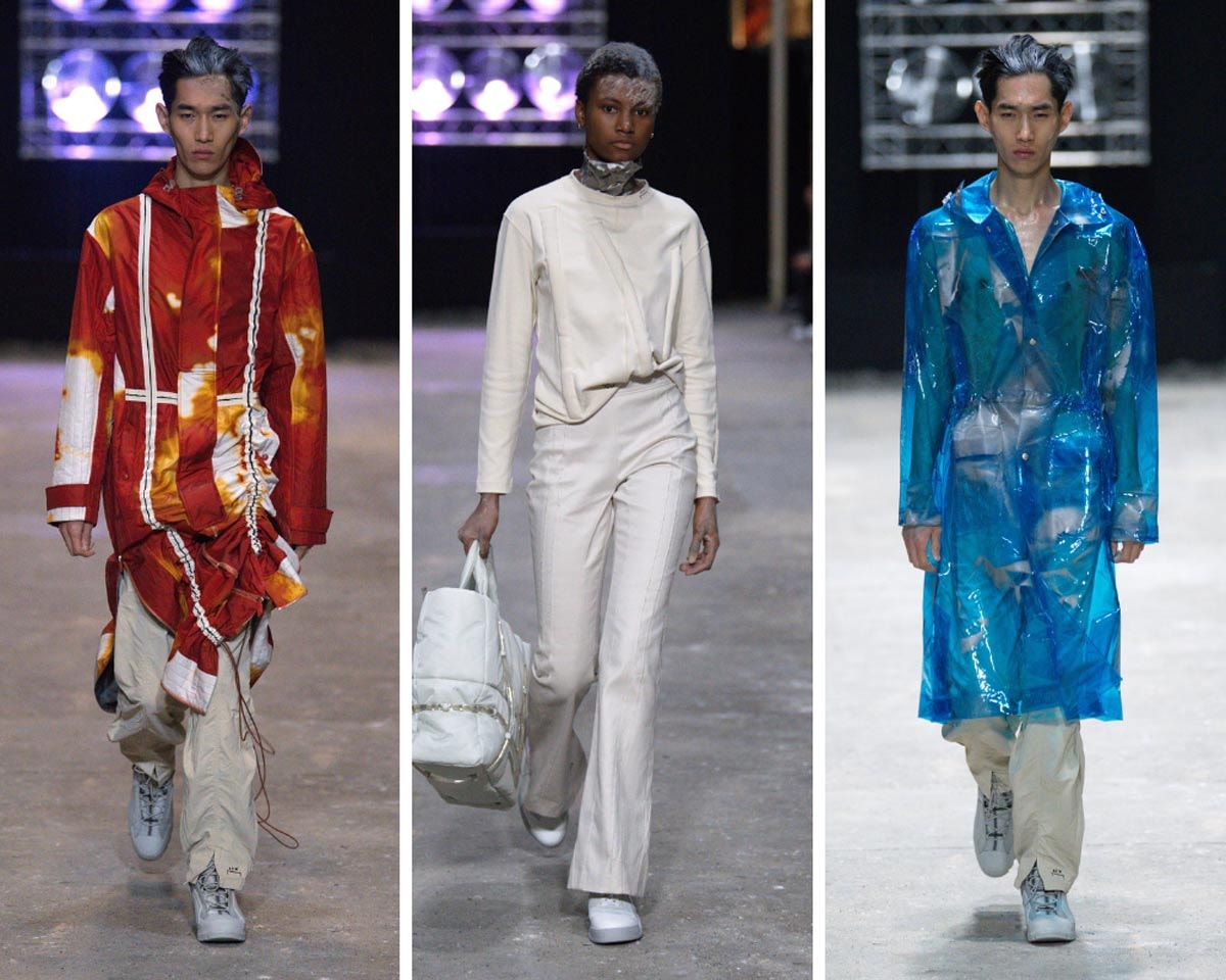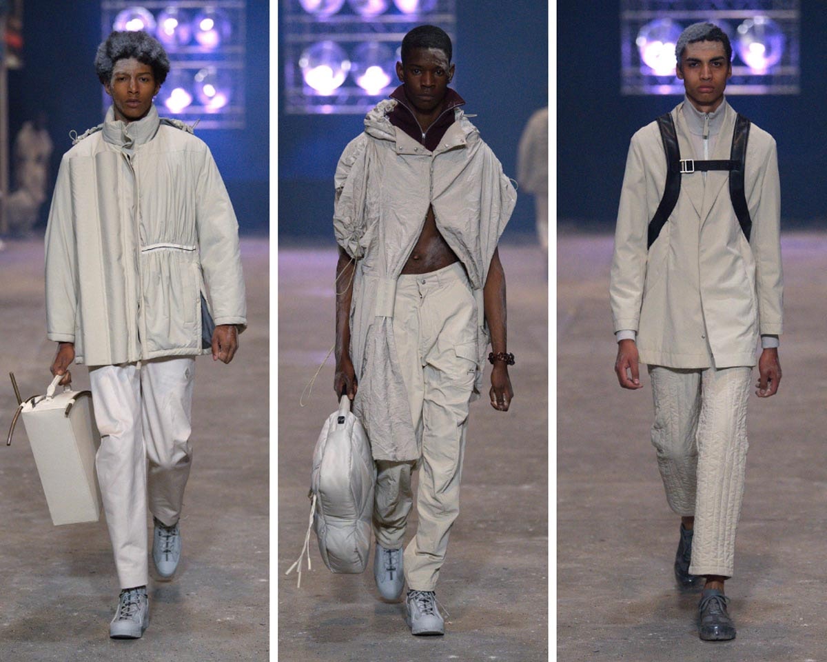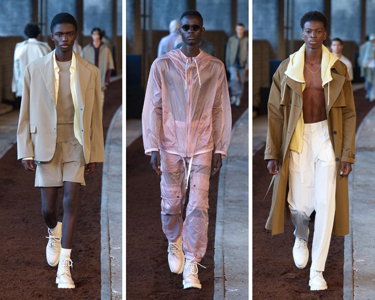 The sun-bleached colour palette inspired by the designer’s childhood in the United Arab Emirates was mainly whites, blacks, greys and nude hues, with the occasional pale yellow, pink and green tones adding a modern, summery hue to the mainly menswear streetwear collection.