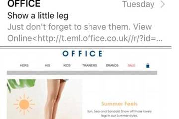 Entitled “Show a little leg” the email was meant to promote the retailer summer collection of sandals, slip-ons and wedges, featuring its latest styles and a pair of ladies legs wearing sandals. However, the tagline below the promotional ad, which reads “Just don’t forget to shave them” has stirred up quite the controversy online, with numerous people online branding Office as “sexist.”