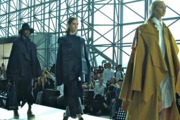 Generously layered tailoring ––sharp yet luxuriously oversize in the collection of Yao Yu, a former architect––in fifty shades of grey for both men and women, gently ushers in a series of dapper pastels for men. Particularly noteworthy are former Thom Browne intern, Jooyoung Kim’s, boating stripe blazers that recall Dick Van Dyke dancing with penguins in Mary Poppins.