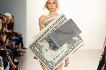 But each one of these designers now faces the daunting task of finding their place in an industry which at the top is controlled by conglomerates and at the bottom is glutted with cheap product, so Kota Okuda’s playful examination of materialism was refreshingly on the money––unfurling dollar bills swallow up one model, another is trapped inside a giant money clip. These Alices must swell or shrink to navigate a Wall Street Wonderland with a Walmart rabbit hole.
