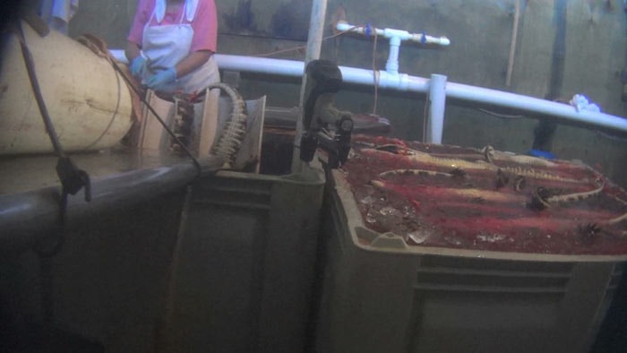 At the Lone Star Alligator Farms in Winnie, Texas, alligators and crocodiles are trapped inside barren and overly crowded pits for up to nine months before being killed for their skin. A US Peta investigator filmed workers shooting alligators in the head, some multiple times, with a captive-bolt gun and viciously hacking into the back of their necks with a box cutter in an attempt to server their blood vessels in a crude effort to kill them. Footage showed many animals surviving the appalling attack and still moving in ice-water bins for several minutes.