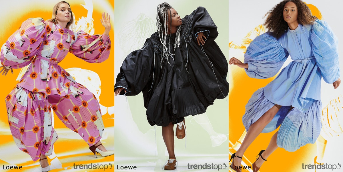 Exuberant and joyful were the descriptions attached to Loewe’s SS21 presentation that focussed on the energy and creativity of fashion. A diverse cast of models posed in parachute-like dresses, ballooning pants and voluminous sleeves reminiscent of the European Old Masters and represents Loewe’s transformation into a ‘cultural brand’ focussing on craft and community.