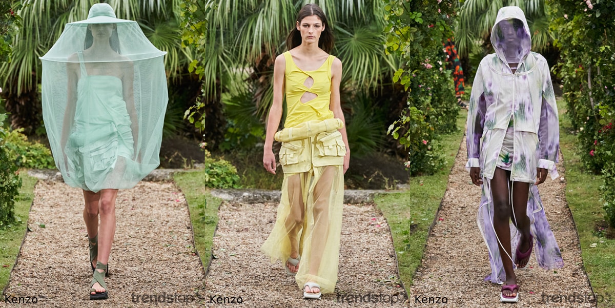 The bee-keeper veiled hats of Felipe Oliveira Baptista’s collection for Kenzo, channelled the designer’s love of nature while their protective qualities also felt timely. Elements such as multi-pocketed jackets and compartmented bags with larger bags hidden inside combined with cocooning outerwear shapes combined futuristic fantasy and functional reality.