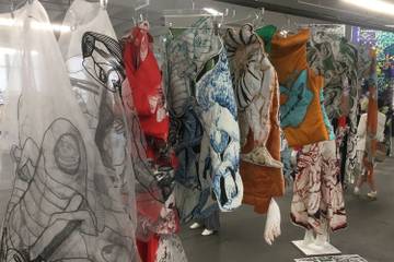 The students however seem to have made the most of the new spacious location––vast, canvas-white, and dotted with cylindrical pillars––by draping printed fabric and framed textiles from the ceiling, unfurling artwork on the floor and establishing little mise en scenes, to capture the mood of their collections. Each student’s work was distinct from the next, and while this exhibit is only a halfway house on the road to the fashion show they’ll reach in just 3 months, there are already a few standouts.