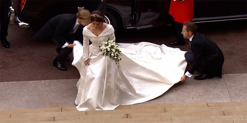 Royal fever has once again taken over Windsor for the wedding of Princess Eugenie to Jack Brooksbank and the bride arrived to the steps of St. George's Chapel in Windsor Castle, wearing a white wedding gown designed by Peter Pilotto and Christopher de Vos.
