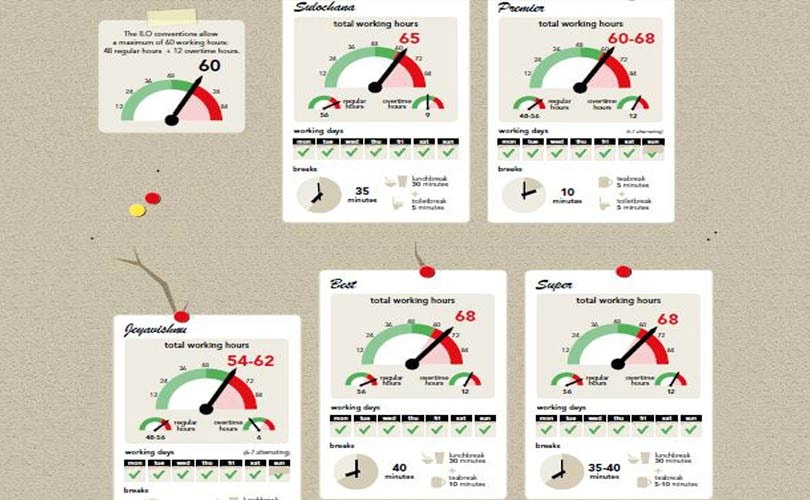 For most of us - if put in the shoes of the girls working in the spinning mills - the working hours alone would be enough to break us. They range from a minimum of 54 and 56 working hours per week (at Jeyavishnu Sulochana, respectively) to 68 at Best and Super and up to 72 hours at Premier. That means slogging for at least eight hours to more than ten hours a day with only a short break - 10 whole minutes at Premier (for tea and toilet as specified) and 30-40 minutes at the other mills. Thus, workers drink very little throughout the day to avoid having to go to the toilet, causing dehydration and serious bladder, kidney and liver implications in the long run.
