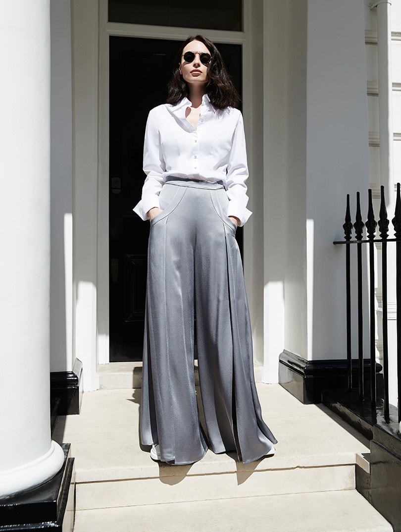 Tailoring is also highlighted in the debut collection with structured matching tapered tuxedo trousers, a colour-matched skirt and palazzo trousers in Italian crepe.