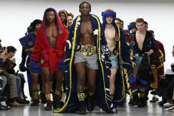 The catwalk became a ringwalk as male models paraded in thick woollen hoodies decorated with medals, inspired by boxers' robes. Punchbags were fashioned into fabric travel bags while the hand-strapping worn by fighters and martial artists provided the inspiration for a set of mittens.
