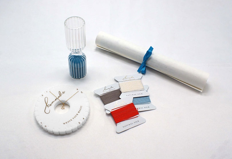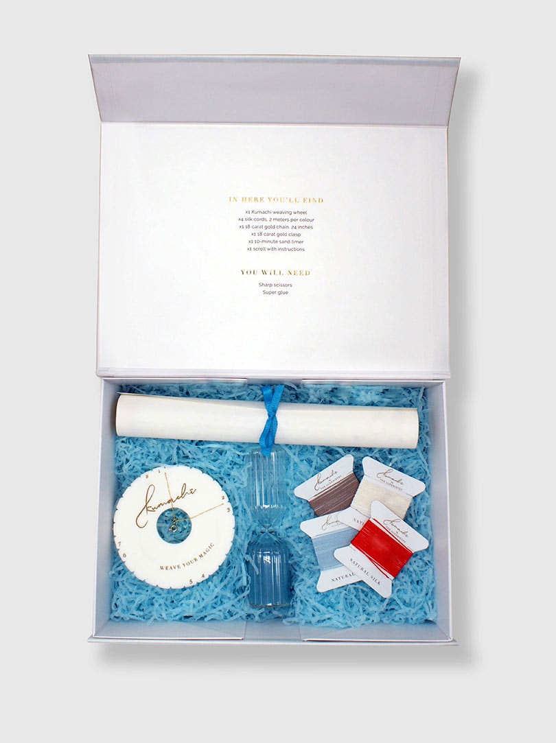 Kumachi derives from two Japanese words, ‘kumi’ meaning ‘coming together’ and ‘hachi’ meaning ‘eight’, signifying the entwining of eight cords, and each Kumachi kit contains four colours of silk thread, an 18-carat gold chain and clasp, a weaving wheel, a luxe glass sand timer and a scroll with step-by-step instructions.