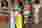 Look 26: a three-tiered rah-rah skirt in green, navy and yellow and a tight navy tee with a re-colored Union Jack flag logo