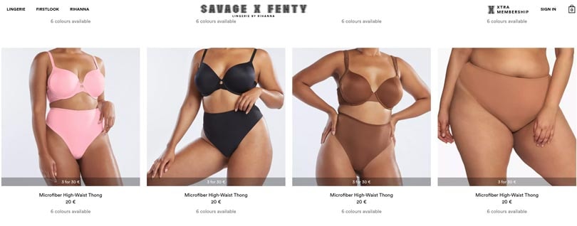 Savage x Fenty, for example, offers 90 pieces of lingerie and sleepwear in seven nude shades. Bra sizes range from 32A to 44DD, while panties go from size XS to XXXL. The brand’s website features models of different sizes and skin tones, cellulitis and stretch marks included, allowing customers to better visualize what the pieces will look like on their bodies. Her beauty line follows a similar strategy: it includes 40 shades of foundation.