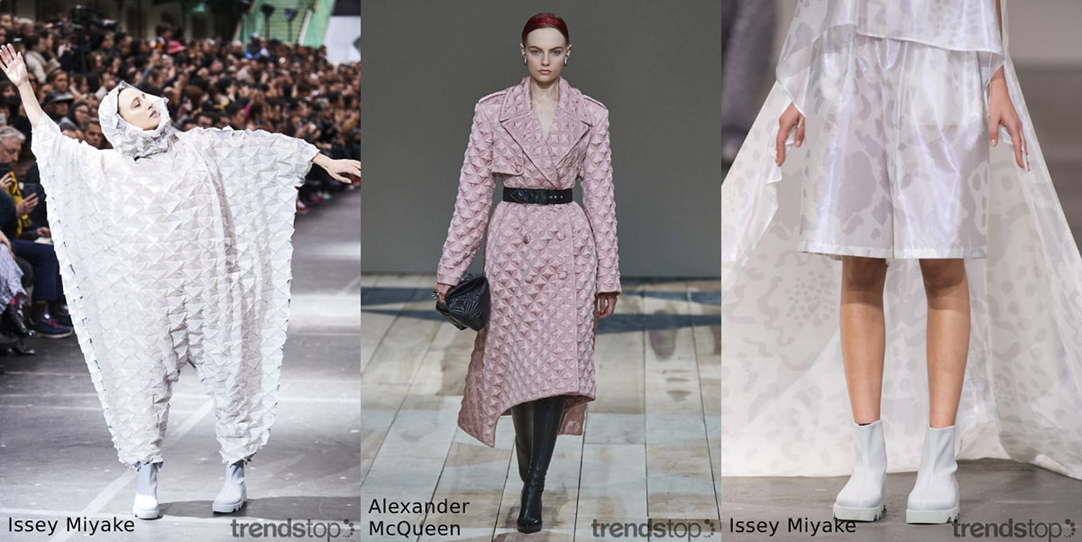 Technical and performance materials take on new and expressive forms. A focus on surface texture sees heat sealed padding and origami-esque folding techniques used to create conceptual 3D formations. A purified colour palette enhances the futuristic aesthetic being applied to sporty materials while tonal colour changes across wovens, introduce subtle artistic and natural elements for greater depth.