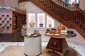 Spanning 3,500 square feet across two floors, the store features key elements of a London townhouse, such as an open fireplace in each room, a sweeping oak carved staircase and stucco plastered ceilings. The brand’s handbags, purses, and ladies accessories are displayed on the ground floor of the store within the double-height Ladies’ Drawing room, which features hand-painted moldings and soft pink detailing.