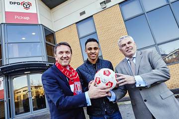 Image: DPD CEO Dwain McDonald with Stoke City Football Club player Peter Odemwingie and head of DPD Pickup Des Travers at the launch.