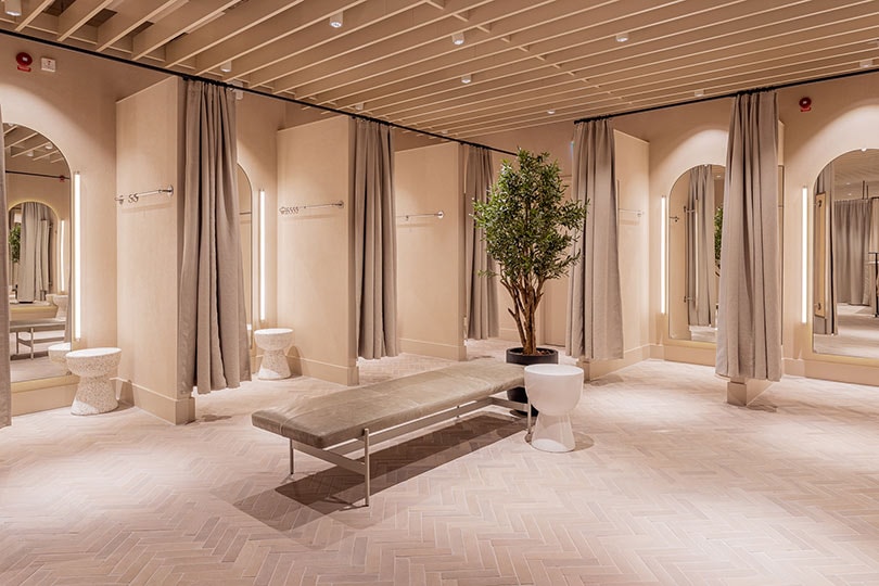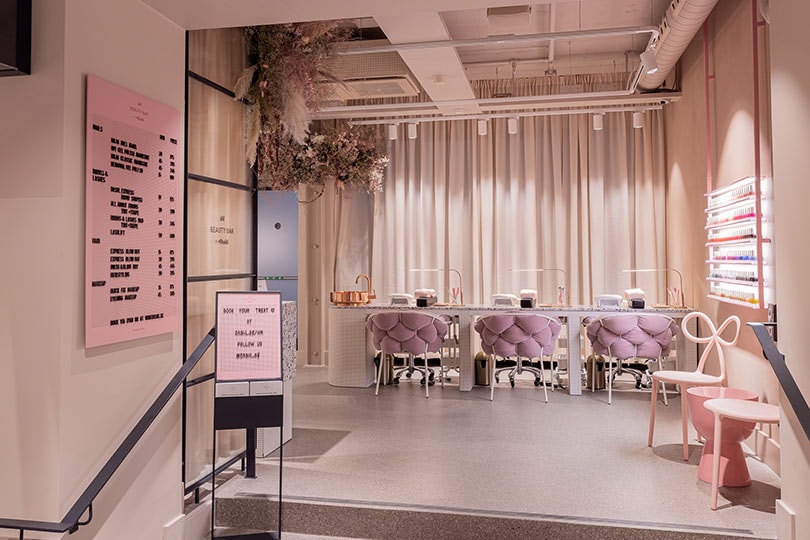 The specialty beauty bar, located on the second floor, will open earlier than the rest of the store, at half past seven in the morning. Customers are now able to go to the beauty bar before they heading off to work. The garments offered on the same floor are of course for sale, so for anyone with a clothing crisis in the morning will have a solution. In the special beauty area, people can have their nails, hair or make-up done. Or all the above. It's also possible to have a face mask at the bar. The beauty bar is also open later in the evening so that people can get a touch-up for a date, for example, as mentioned in the tour. The decor of the area sets it apart from the rest of the store. Giving off Instagram-worthy vibes with pink chairs and various floral arrangements that decorate the ceiling.