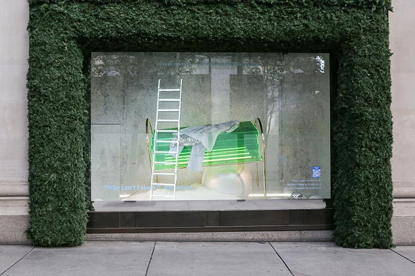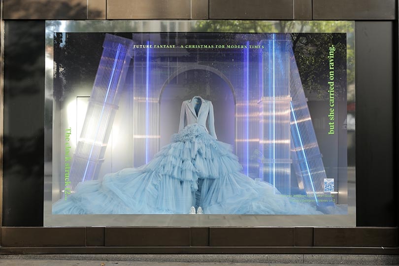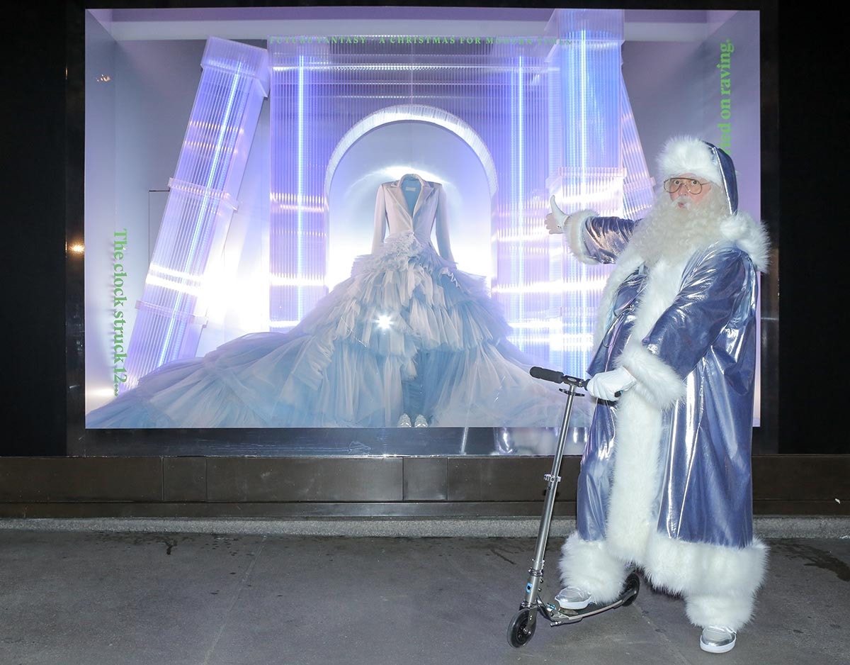 Other key windows include a magic translucent wardrobe, featuring everything princess would want to wear, set in a snow mound with ice and futuristic trees, while a magic mirror scene showcases interactive content of models walking through a future fantasy landscape, bringing the latest looks to life digitally, and a window dedicated to Cinderella features an impossibly large and dramatic gown by Christian Siriano spilling out of the translucent arches of the palace ballroom.