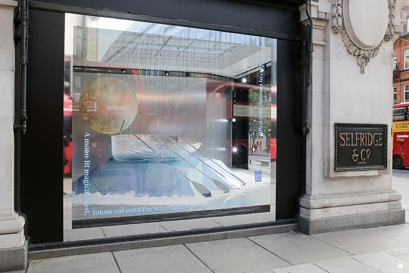 Selfridges London's biggest triple-sided window at the corner of Oxford Street and Orchard Street features a magical shipwrecked feast amongst the waves, with giant magical moon and moving boat and oars, reimagining the boat scene from The Owl and The Pussycat.