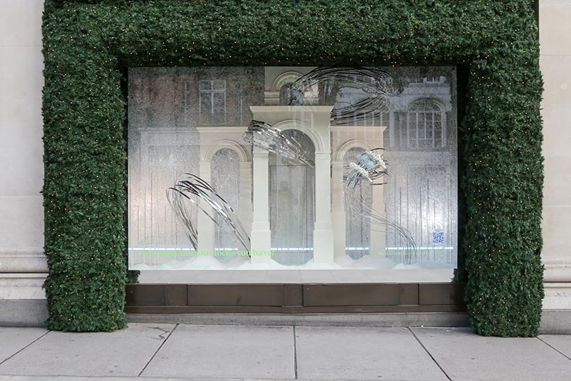 The overarching colour palette of the windows and in-store displays explore silver, white, blue and green along with mirror, crystal and transparency, and features more than 85,000 Christmas baubles, with many reused from existing displays, explained Selfridges, as well as over 15,000 metres of LED lights decorate the dense spruce foliage and handrails inside and outside the London store.