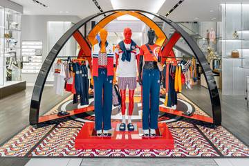 The in-store pop-up showcases the 24-piece Michael Kors x Ellesse capsule collection, featuring track jackets and pants, vintage-style swimsuits, chunky sneakers, logo slides, neon bucket hats and bags, all emblazoned with a one-of-a-kind insignia that fuses Michael Kors' iconic logo with Ellesse's tennis-and-ski-inspired one.