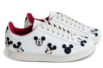 The collection, available for spring/summer 2016, features two lace-up tennis trainers in white and anthracite adorned with Mickey Mouse embroidery, which form an artistic jacquard pattern on the shoe's surface. The leather trainers retail for 130 pounds each.
