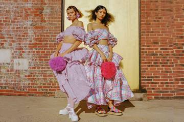 Vibrant colors and energetic patterns are prominent throughout the collection. Signature silhouettes including the Slouchy Track Jacket are reimagined in a pink and purple Space Jacquard and Midnight Sequin Floral. Select styles, including the Carnival Skirt and Dress and Balloon Pant, get playful in a “Christmas Plaid” jacquard, and a lilac seersucker. Intricate hand beaded floral panels in shades of pink and blue can be found on the Carnival Dress and two-piece bandeau skirt set. Sequins reappear in a Midnight Floral embellishing a Track Suit fit for a night out and an elegant Teepee Dress. Relaxed Bowling Shirt and Short Sets are reinvented in Sunflower Pinstripes, and Christmas Plaid. A standout detail is the Puff Sleeve found on the Marshmallow Bandeau and Wrap Top, wearable and full of character.