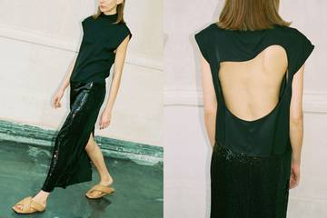 Whites, sand stone, vanilla and warm caramel hues dominate the colour palette. This light range is accentuated with a bright pea-green and completed by dark neutrals such as navy, midnight blue and black. The house’s monochrome gender fluid suiting offers powerful contrasts: tailored wools are connected with sheer fabrics. Shiny silk is panelled with dry cotton. Open weaved linen jackets have angular and elaborate shoulders that morph into organic and rounded shapes. They are styled with bra tops and super wide pleat-front trousers. Crochet, sequin and slip skirts are paired with delicate lace tops or with oversized shirts featuring lace applications, curved button plackets, patched panels or pleats. A deep V-neckline is recurring throughout the collection on tops, dresses as well as collar- and buttonless vests and jackets. Fluid dresses and tops come with long slits and open backs. Soft asymmetries are created with fabric knots and rounded cut-outs. Drapes form different silhouettes defined by the body.