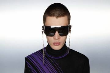Graphic damier touches decorate the fitted sweaters, while contrasting coating create geometric color blocks on poplin shirts.Offering reassuring protection and the right dose of style, the outwear includes a jacket with an incorporated zippered mask, evoking the fencing world, but also warm shearling jackets decorated with metallic fangs and leather perfectos with inlaid harnesses.