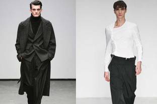 E. Tautz found inspiration in the 1940s working men's wardrobe, which saw traditional tailoring mix with uniform references and knitwear. Vintage silhouettes were paired with voluminous heavy-duty outerwear and wide-leg trousers with blazers in classic proportions. Knitwear added the casual touch, as did weekend sportswear like a golf jacket car...